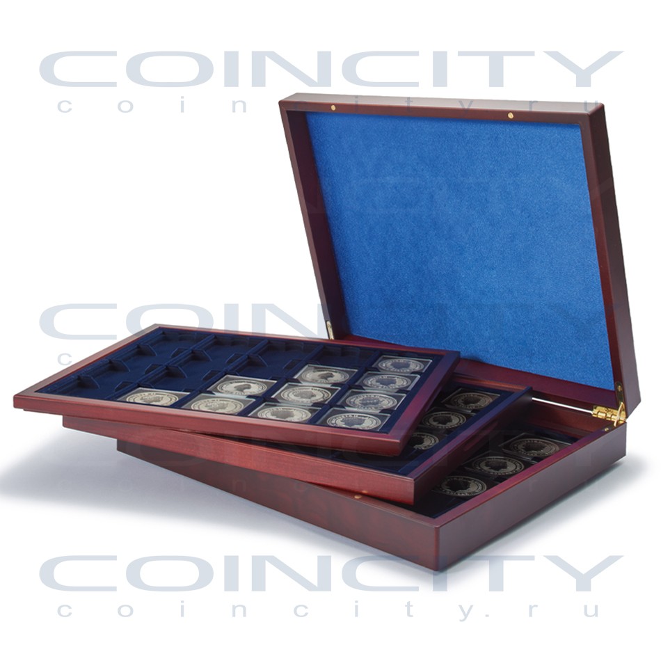 Коробка для монет с отделкой под красное дерево. Подушечка на крышке из синего шёлка, планшеты с велюровым покрытием. 3 планшета с 20 квадратными ячейками 50x50 мм для хранения монет в холдерах или капсулах Quadrum. Наружный формат 330x270x55 мм.