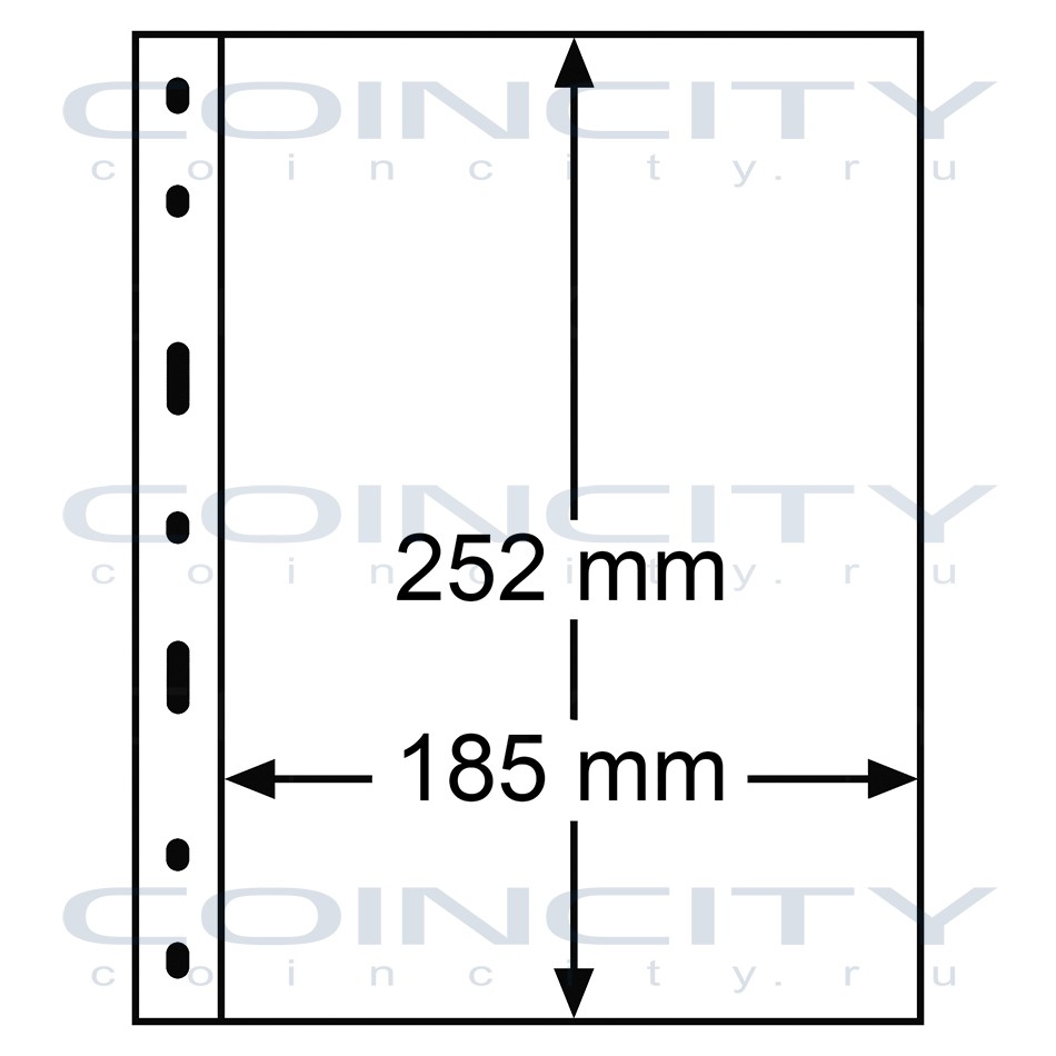Лист для банкнот из прозрачного пластика. 1 карман размером 185x252 мм. Загрузка коллекционного материала производится с обратной стороны листа. Наружный формат 202x257 мм. Подходит к папкам-переплётам Optima.