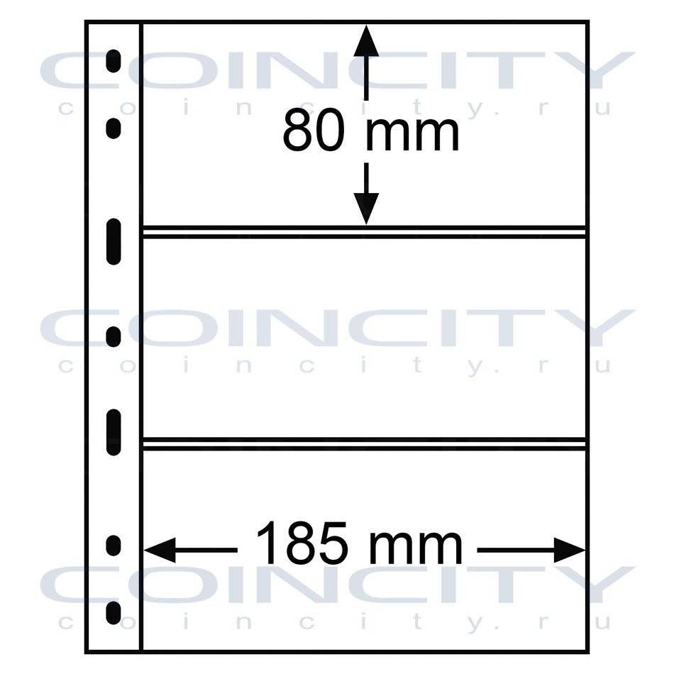 Лист для банкнот из прозрачного пластика. 3 кармана размером 185x80 мм. Загрузка коллекционного материала производится с обратной стороны листа. Наружный формат 202x257 мм. Подходит к папкам-переплётам Optima.
