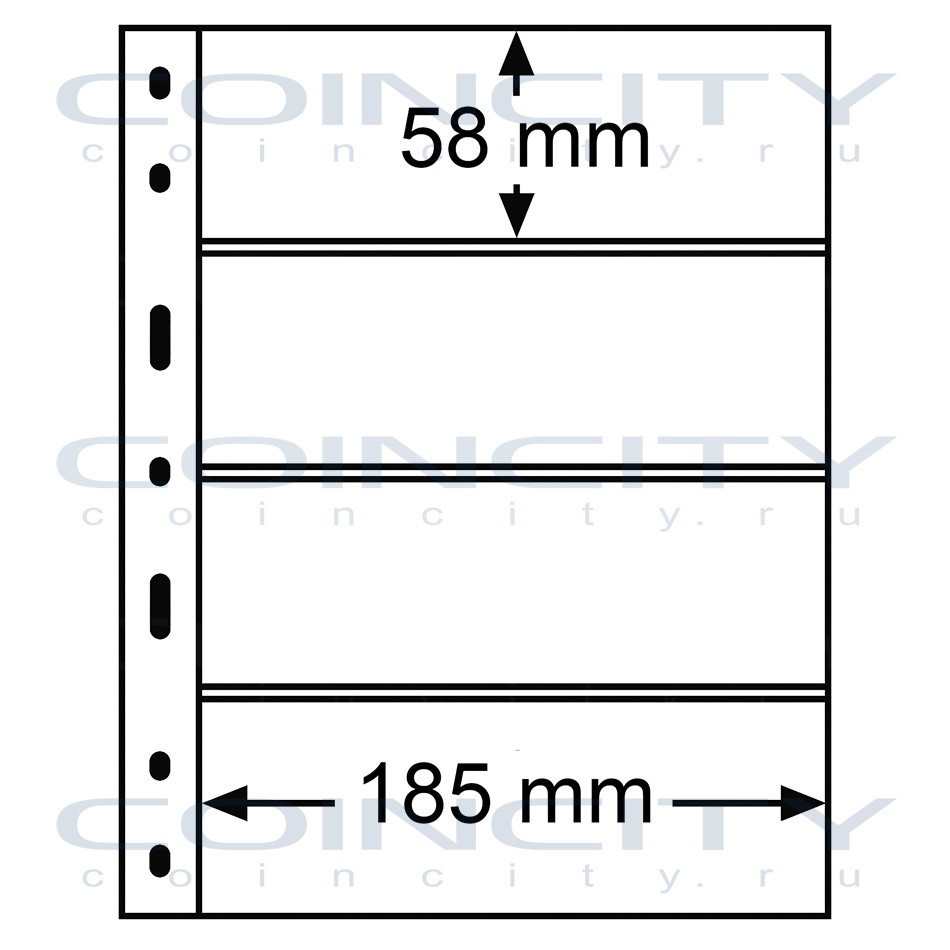 Лист для банкнот из прозрачного пластика. 4 кармана размером 185x58 мм. Загрузка коллекционного материала производится с обратной стороны листа. Наружный формат 202x257 мм. Подходит к папкам-переплётам Optima.