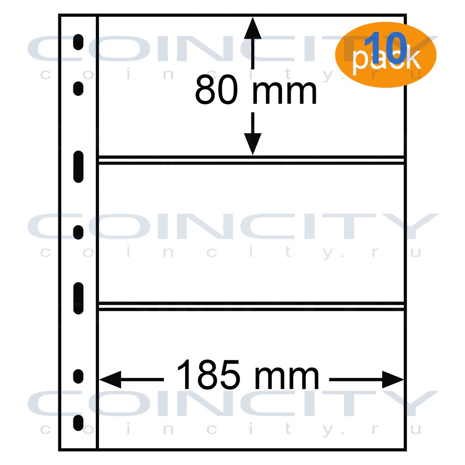 Листы для банкнот из прозрачного пластика. 3 кармана размером 185x80 мм. Загрузка коллекционного материала производится с обратной стороны листа. Наружный формат 202x257 мм. Подходят к папкам-переплётам Optima.