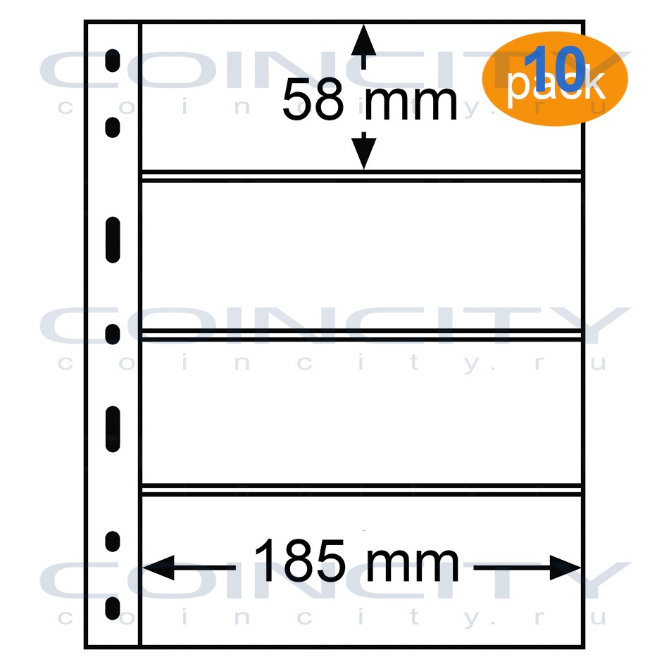 Листы для банкнот из прозрачного пластика. 4 кармана размером 185x58 мм. Загрузка коллекционного материала производится с обратной стороны листа. Наружный формат 202x257 мм. Подходят к папкам-переплётам Optima.