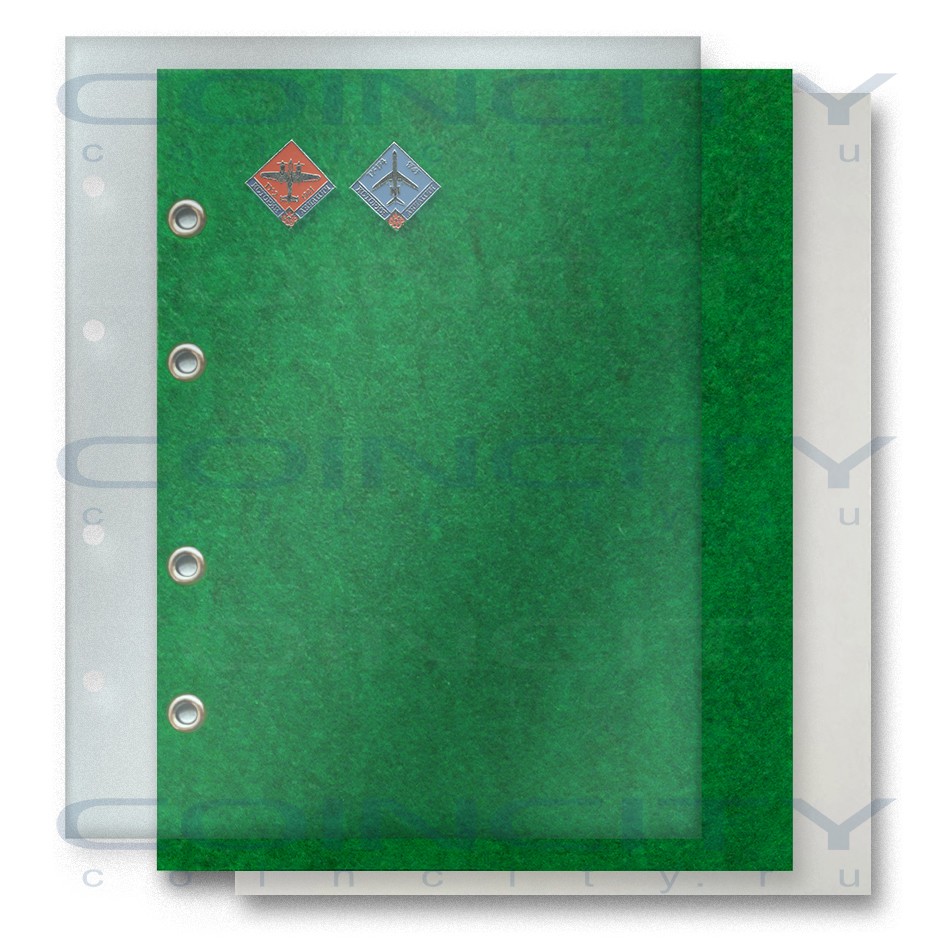 Лист для значков. Войлок зелёного цвета с прокладочным листом из прозрачного ПВХ и разделителем из мелованного картона. Наружный формат 200x250 мм. Подходит к папкам-переплётам Optima.