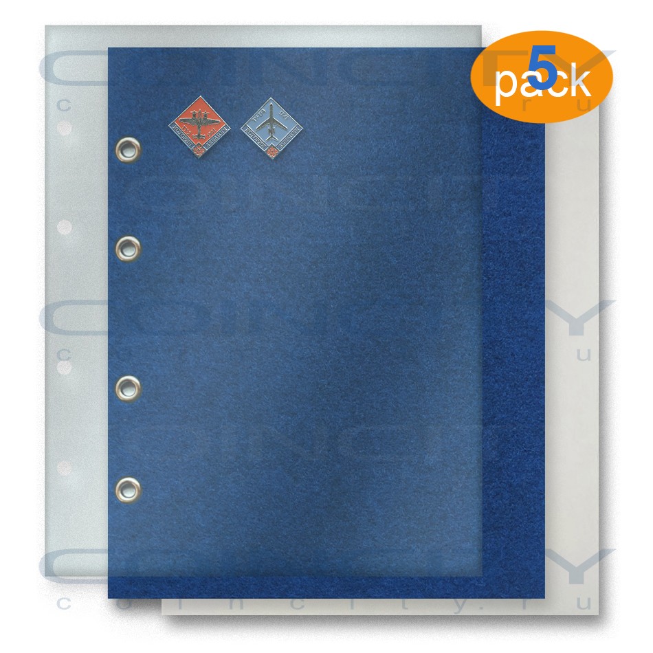 Листы для значков. Войлок синего цвета с прокладочными листами из прозрачного ПВХ и разделителями из мелованного картона. Наружный формат 200x250 мм. Подходят к папкам-переплётам Optima. 5 штук в упаковке..