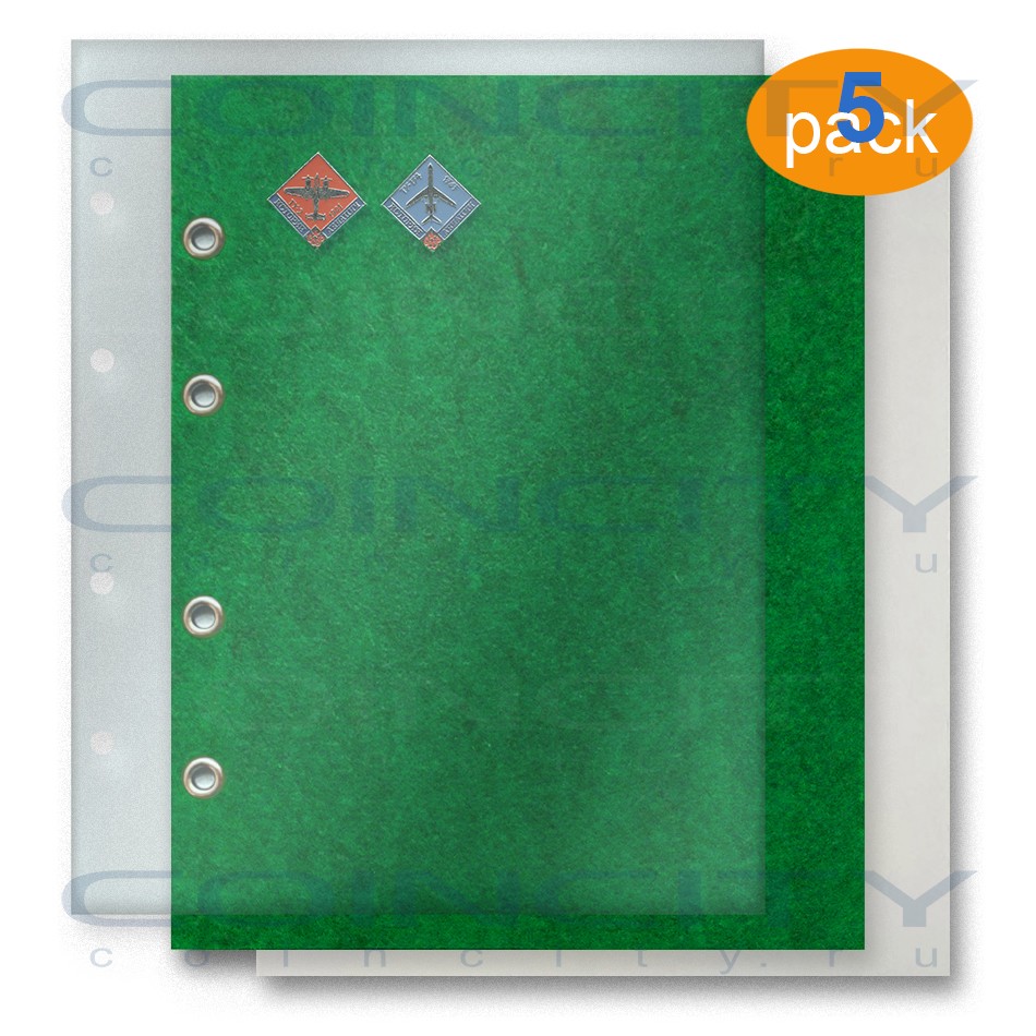 Листы для значков. Войлок зелёного цвета с прокладочными листами из прозрачного ПВХ и разделителями из мелованного картона. Наружный формат 200x250 мм. Подходят к папкам-переплётам Optima. 5 штук в упаковке.