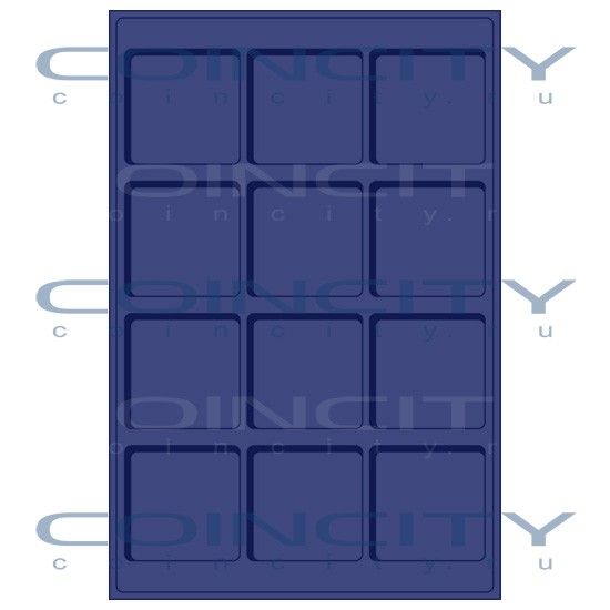 Планшет для 12 монет с квадратными ячейками 66x66 мм. Цвет синий, наружный формат 334x220x9 мм. Подходит к кейсам KO3, KO6 и папке MK4TABLEER.