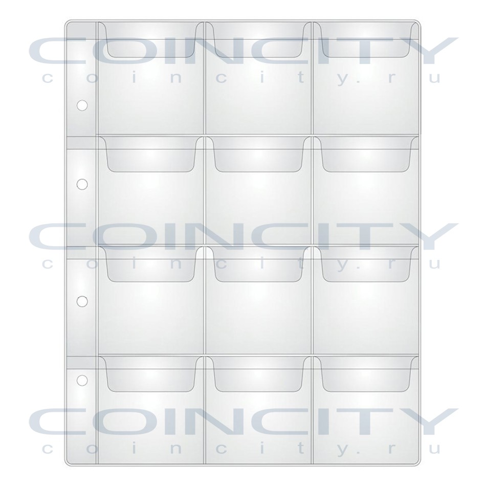 Лист изготовлен из пленки повышенной прозрачности. 12 ячеек с клапаном, для монет диаметром до 54 мм. Наружный формат 200x250 мм. Подходит к папкам-переплётам Optima.