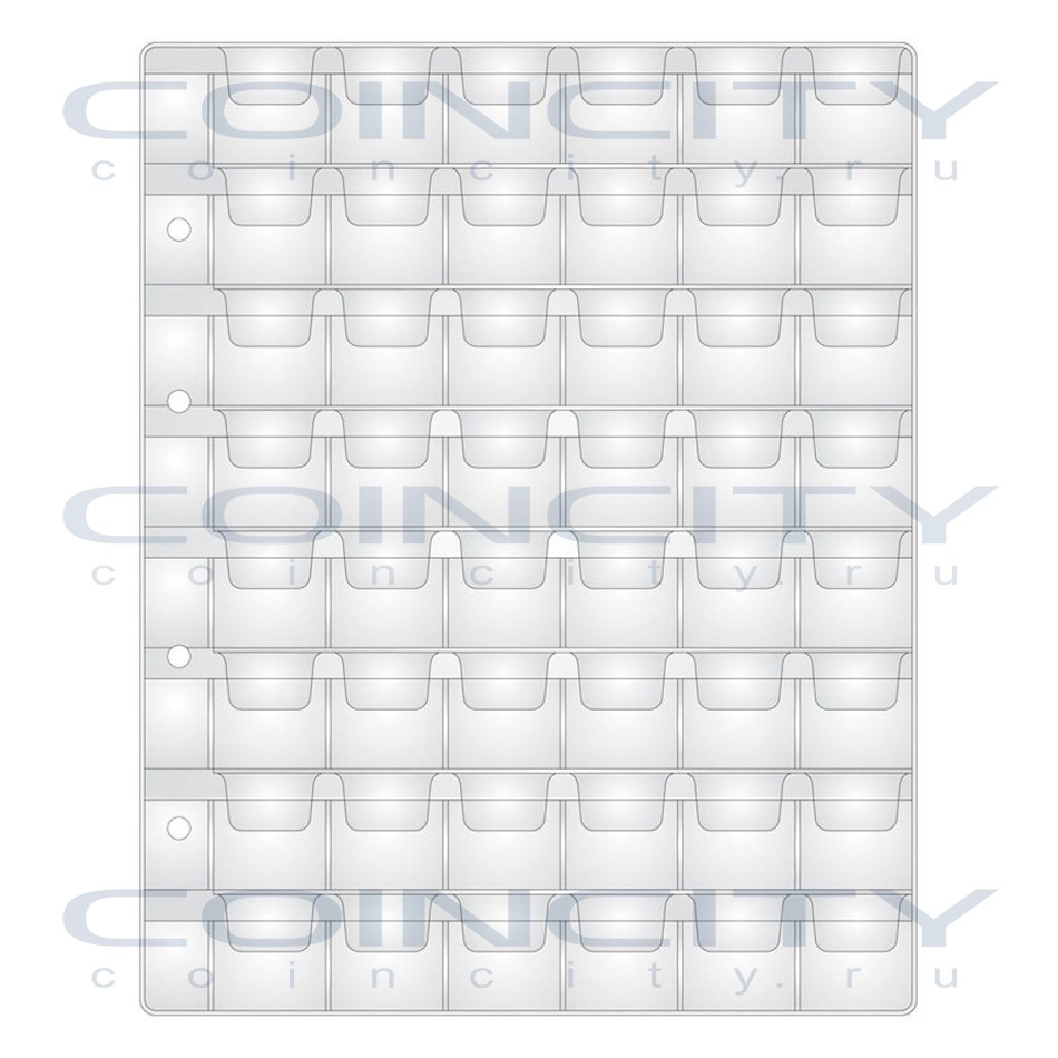 Лист изготовлен из пленки повышенной прозрачности. 48 ячеек с клапаном, для монет диаметром до 25 мм. Наружный формат 200x250 мм. Подходит к папкам-переплётам Optima.