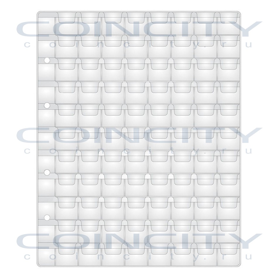 Лист изготовлен из пленки повышенной прозрачности. 88 ячеек с клапаном, для монет диаметром до 17 мм. Наружный формат 200x250 мм. Подходит к папкам-переплётам Optima.
