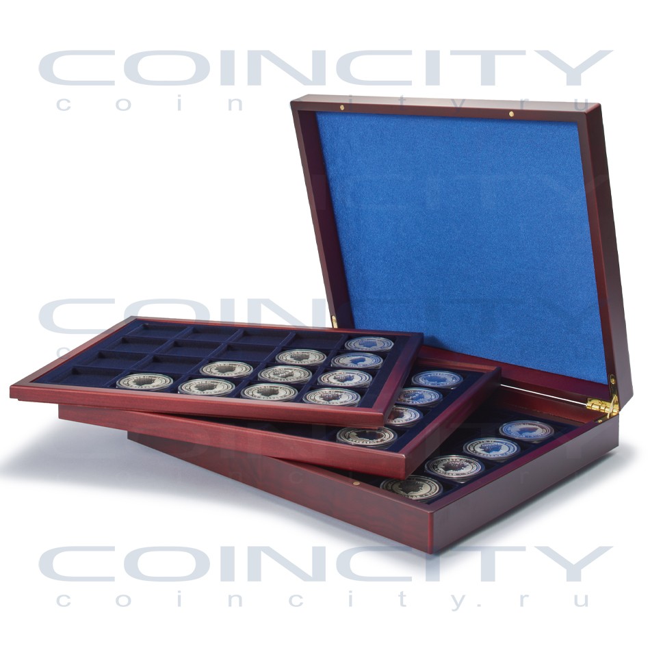 Коробка для монет с отделкой под красное дерево. Подушечка на крышке из синего шёлка, планшеты с велюровым покрытием. 3 планшета с 20 квадратными ячейками 48x48 мм каждый. Наружный формат 330x270x55 мм.