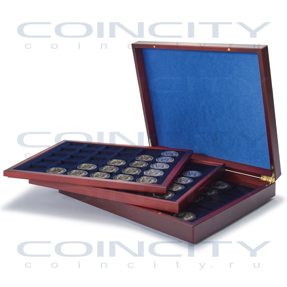 Коробка для монет с отделкой под красное дерево. Подушечка на крышке из синего шёлка, планшеты с велюровым покрытием. 3 планшета с 30 квадратными ячейками 39x39 мм каждый. Наружный формат 330x270x55 мм.