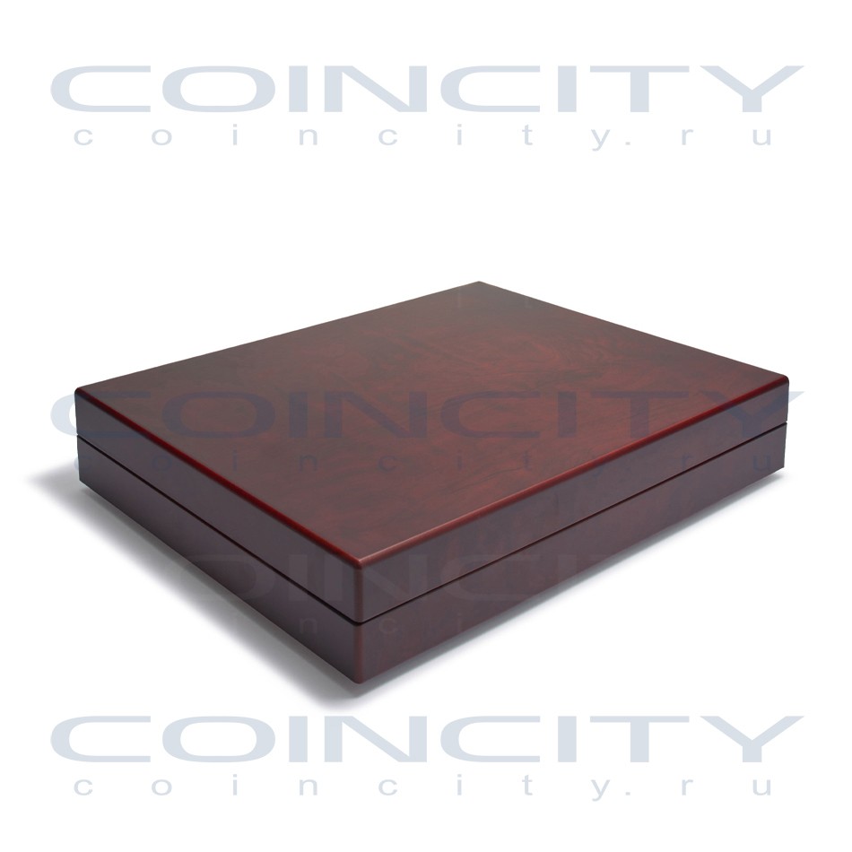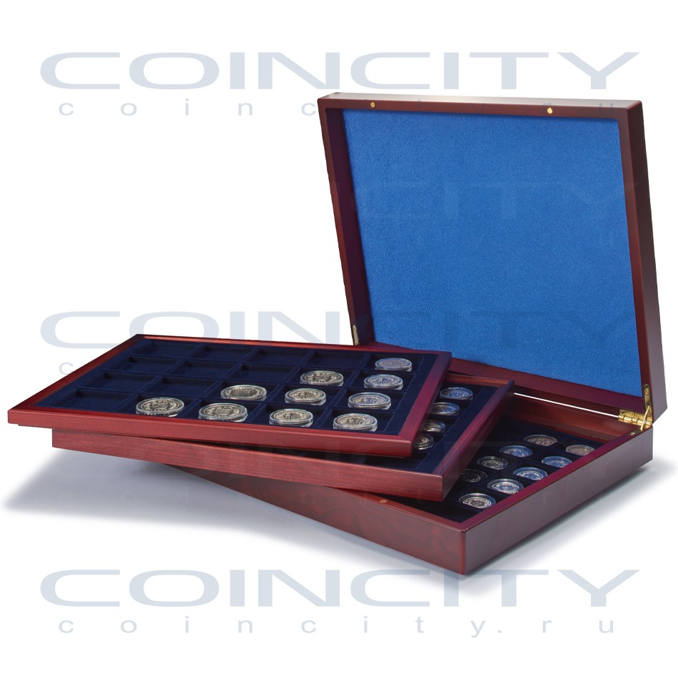 Коробка для монет с отделкой под красное дерево. Подушечка на крышке из синего шёлка, планшеты с велюровым покрытием. 1 планшет с 20 квадратными ячейками 48x48 мм, 1 планшет с 30 ячейками 39x39 мм и 1 планшет с 48 ячейками 30x30 мм. Наружный формат 330x270x55 мм.